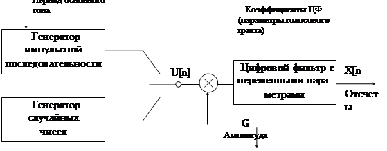На временном интервале порядка 10ms характеристики ЦФ можно считать неизменными. На каждом таком интервале ЦФ может быть охарактеризован совокупностью своих коэффициентов. В случае вокализованной речи ЦФ возбуждается генератором квазиканонической импульсной последовательности, расстояние между соседними импульсами которого соответствует периоду основного тона. На интервалах невокализованной речи ЦФ возбуждается генератором случайных чисел, который вырабатывает шумовой сигнал с равномерной спектральной плотностью. В обоих случаях сигнал, поступивший на ЦФ, управляется по амплитуде.