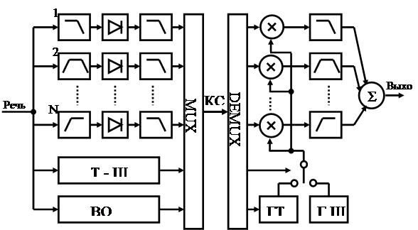 Для получения выходного синтезированного речевого сигнала выходы всех каналов блока синтеза суммируются.