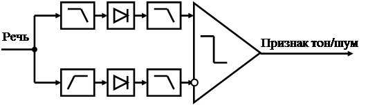 Кроме оценки энергии сигнала в частотных полосах, в блоке анализа также производится оценка характера речевого фрагмента. В детекторе тон/шум(Т-Ш) оценивается: вокализованным или фрикативным является данный фрагмент речевого сигнала. Такой детектор может быть реализован через определение числа переходов через ноль речевого сигнала (для вокализованных фрагментов в отличие от фрикативных число переходов через ноль невелико) или оценкой энергии сигнала в полосах до 800 Гц и более 2КГц (структурная схема такого детектора представлена на рисунке 9.3).