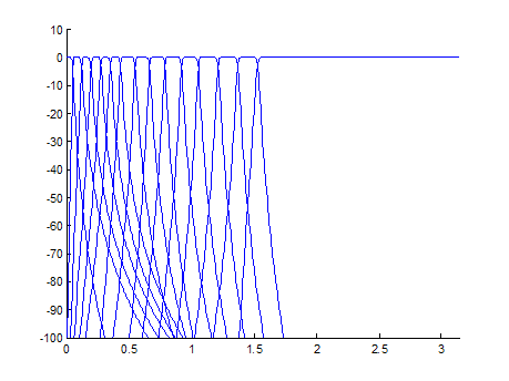 Фильтры блока анализа обеспечивают тональное разделение спектра сигнала. Для перекрытия всей полосы звуковых частот, наряду с полосовыми, в гребенке используют фильтры НЧ и ВЧ (в самых низкочастотном и высокочастотном каналах). Типовая амплитудно-частотная характеристика гребенки фильтров, в случае равномерного разделения каналов может иметь следующий вид: