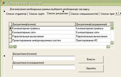 · ввод данных о дисциплинах, назначенных кафедрой, дисциплинах специализации, дисциплинах по выбору студента;