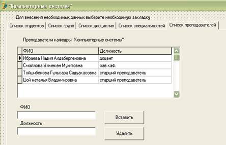 Практически все современные виды деятельности человека немыслимы без использования современных информационных средств, компьютерных технологий. В Таразском Государственном Университете на кафедре «Компьютерные системы» готовят специалистов по самым современным, перспективным и престижным специальностям, таким как вычислительная техника и программное обеспечение, информационные системы, компьютерные системы управления. Деятельность кафедры связана с учетом большого количества информации, которую необходимо систематизировать.