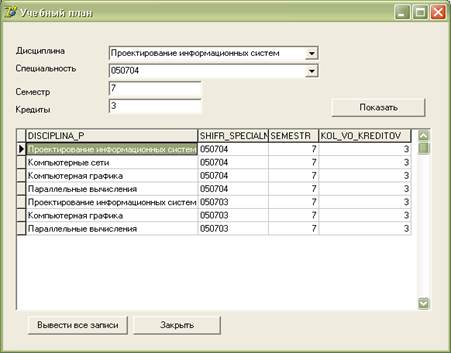 - данные о дисциплинах (наименования, кредиты, наличие курсовой работы).
