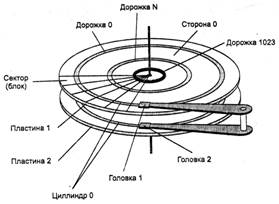 Основным типом устройства, которое используется в современных вычислительных системах для хранения файлов, являются дисковые накопители. Эти устройства предназначены для считывания и записи данных на жесткие и гибкие магнитные диски. Жесткий диск состоит из одной или нескольких стеклянных или металлических пластин, каждая из которых покрыта с одной или двух сторон магнитным материалом. Таким образом, диск в общем случае состоит из пакета пластин (рис. 1).