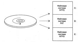 В частном случае, когда все дисковое пространство охватывается одним разделом, логическое устройство представляет физическое устройство в целом. Если диск разбит на несколько разделов, то для каждого из этих разделов может быть создано отдельное логическое устройство. Логическое устройство может быть создано и на базе нескольких разделов, причем эти разделы не обязательно должны принадлежать одному физическому устройству. Объединение нескольких разделов в единое логическое устройство может выполняться разными способами и преследовать разные цели, основные из которых: увеличение общего объема логического раздела, повышение производительности и отказоустойчивости. Примерами организации совместной работы нескольких дисковых разделов являются так называемые RAID-массивы, подробнее о которых будет сказано далее. На разных логических устройствах одного и того же физического диска могут располагаться файловые системы разного типа. На рис. 3 показан пример диска, разбитого на три раздела, в которых установлены две файловых системы NTFS (разделы С и Е) и одна файловая система FAT (раздел D).