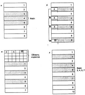 Рис. 4. Физическая организация файла: непрерывное размещение (а); связанный список кластеров (б); связанный список индексов (в); перечень номеров кластеров (г)
