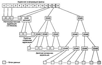 Если размер файла превышает 12+2048 = 2060 кластеров, то используется 14-е поле, в котором находится номер кластера, содержащего 2048 номеров кластеров, каждый из которых хранят 2048 номеров кластеров данных файла. Здесь применяется уже двойная косвенная адресация. С ее помощью можно адресовать кластеры в файлах, содержащих до 8192*(12+2048+20482 ) - 3,43766*1O10 байт.