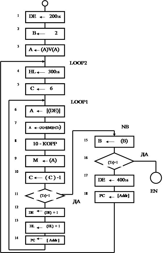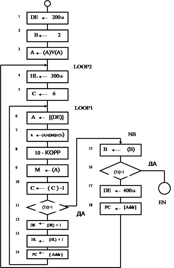 ;бл.14 БП к блоку 6 для ;суммирования след. байтов ;чисел Х1 и Х2 либо Х3 и ;(Х1+Х2)(к началу внешнего цикла) (т.10) |