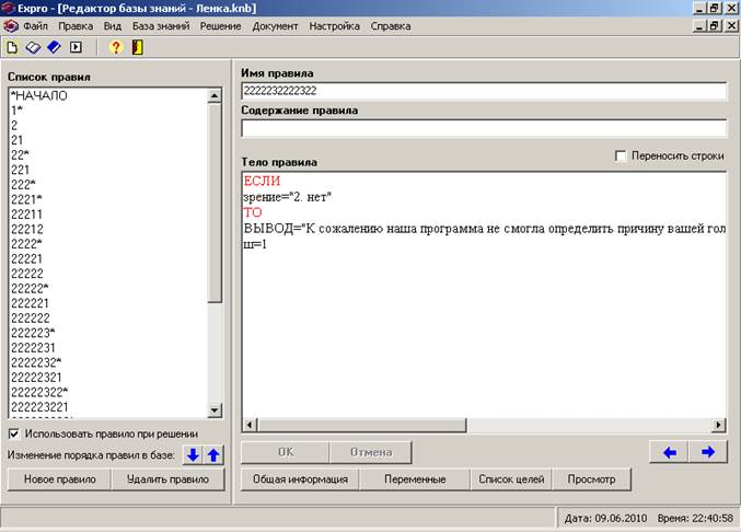 · Правил, которые состоят из двух частей: предпосылки и заключения. Правила в программе имеют формат: