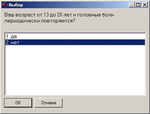 1. Данная экспертная система помогает простому пользователю быстро определить на ранних стадиях причины головной боли и действия по оказанию первой помощи. Данная программа охватывает большой диапазон симптомов и наиболее распространённые причины, могущие вызывать головную боль.