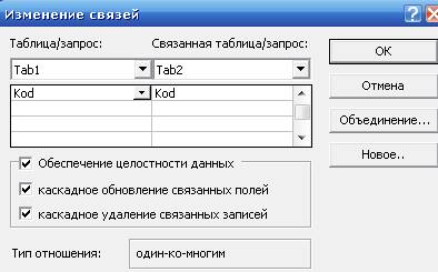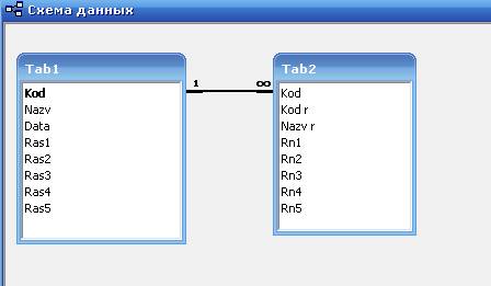 Выбираем в меню «Сервис» - «Схема данных», добавляем созданные таблицы. Выделяем в таблице 1 поле «Kod» и, удерживая нажатой левую кнопку мышки, перетаскиваем это поле на поле с таким же названием во второй таблице. В открывшемся диалоговом окне необходимо отметить флажками следующие пункты: