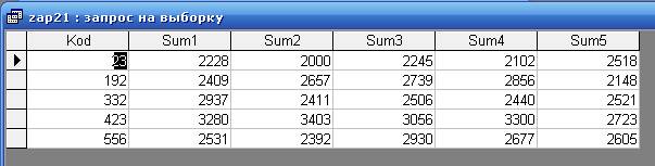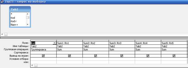 SELECT Tab2.Kod, Sum(Tab2.Rn1) AS Sum1, Sum(Tab2.Rn2) AS Sum2, Sum(Tab2.Rn3) AS Sum3, Sum(Tab2.Rn4) AS Sum4, Sum(Tab2.Rn5) AS Sum5