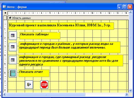 Для создания меню откроем конструктор и расположим на нём командные кнопки и метки к ним.