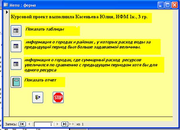 В ходе данного курсового проекта, поставленная цель была реализована (пункты 1 и 2 задания по КП были выполнены на Access ., 3 и 4 на Visual Basic .(обработка БД Access)). Были выполнены входящие в индивидуальное задание задачи по следующим разделам VB: программирование линейных алгоритмов, программирование разветвляющихся алгоритмов, программирование циклических алгоритмов, создание процедур и функций пользователя.