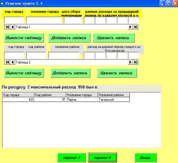 4. По выбираемым ресурсам вывести информацию о районе и городе с максимальным расходом.
