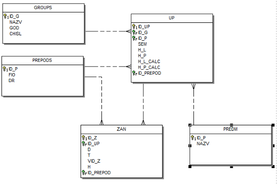 База данных содержит четыре таблицы: Учебные планы, Группы, Предметы и Занятия. Таблицы связаны отношениями «один-ко-многим» как показано на ER-диаграмме: