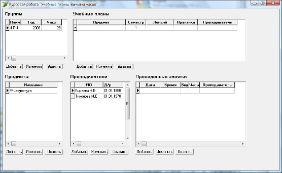 В таблице УЧЕБНЫЕ ПЛАНЫ пользователь видит планы только той группы, которая является текущей в таблице ГРУППЫ, а в таблице ЗАНЯТИЯ – только те занятия, которые проведены по текущему плану в таблице УЧЕБНЫЕ ПЛАНЫ.