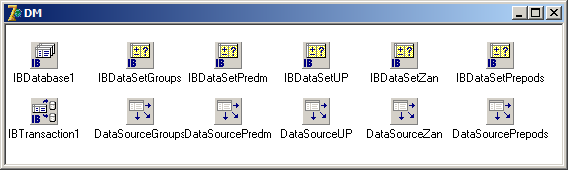 Все невизуальные компоненты: IBDatabase, IBTransaction, IBDataset, DataSource вынесены в специальный контейнер DataModule: