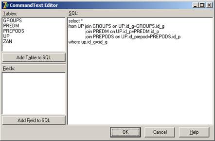 На следующем рисунке представлено окно редактирования текста запроса на выборку компонента IBDataSetUP. Для реализации master-detail используется свойство IBDataSetUP. DataSource:= DataSourceGroups и условие отбора по значению текущей группы: