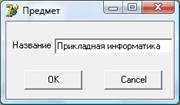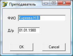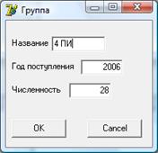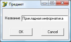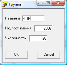 При добавлении записи появляется аналогичное окно с пустыми полями для ввода новых значений. Кнопка OK закрывает окно с сохранением, кнопка Cancel– без сохранения.