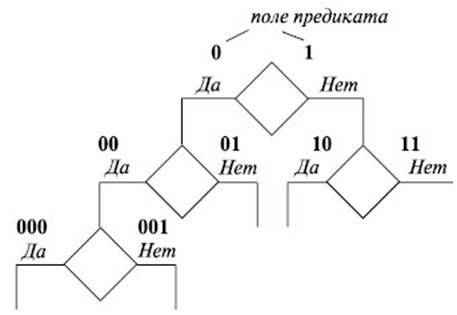 4. Применение предикатов. Предикатный подход исходит из предпосылки, что возросшие мощности микропроцессоров позволяют запускать параллельно команды из разных ветвей условного ветвления вместо того, чтобы ожидать формирования истинных признаков для выбора правильного направления или полагаться на блок предсказания переходов, рискуя прийти к необходимости перезагрузки достаточно длинных конвейеров в случае неудачного предсказания. При этом каждая команда снабжается специальным полем условия (предикатом) (рис. 11.1). По мере определения истинных признаков ветвления те команды, предикаты которых указывали, что они выбраны из другой ветви, снимаются с обработки в конвейере. Результаты команд не записываются в прием ник до определения правильности направления перехода.