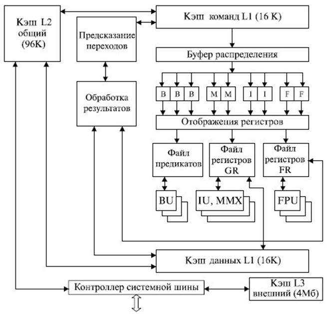 Данный микропроцессор относится к новой, 64-разрядной архитек туре IA-64. Структура микропроцессора Itanium представлена на рис. 11.2.