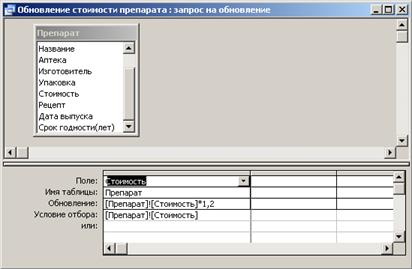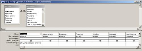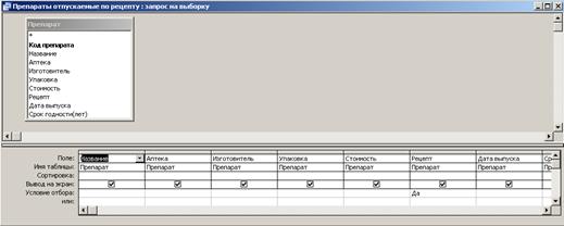 Рис. 16. Запрос на выборку для определения препаратов отпускаемых по рецепту