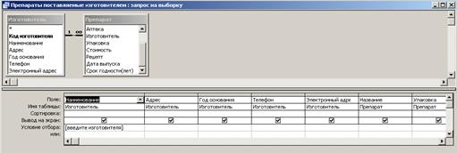 Рис. 12. Параметрический запрос для определения препаратов поставляемых изготовителем