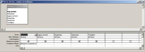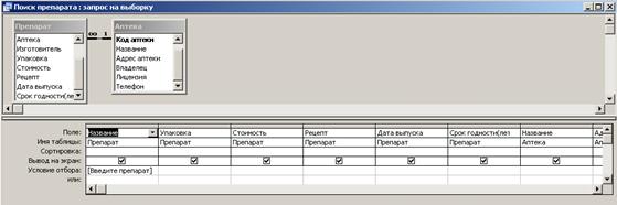 Рис. 15. Параметрический запрос для поиска сведений об аптеке