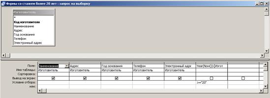 Рис. 17. Запрос на выборку фирмы со стажем более 20 лет