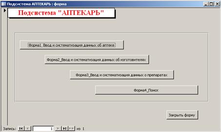 Поскольку все задачи решаются в основном Аптекарем, а два других пользователя решают лишь некоторые задачи из этого списка, далее более подробно рассмотрим только подсистему «Аптекарь». Для выполнения задач, решаемых Аптекарем, используем 4 формы: