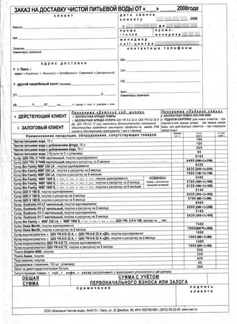 | Заказ на доставку чистой питьевой воды | № договора Номер промоутера Номер промоточки ФИО клиента Адрес клиента Телефон Дата звонка Код воды Код оборудования |