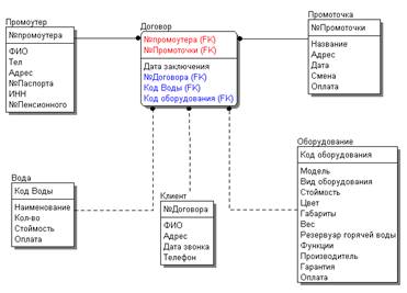 Сущности ВОДА, ОБОРУДОВАНИЕ, ЗАКАЗЧИК, ПРОМОУТЕР и ПРОМОТОЧКА являются независимыми, поскольку каждый их экземпляр однозначно идентифицируется своим кодом (номером) без определения его отношений с другими сущностями. Сущность ДОГОВОР является зависимой, поскольку Первичными ключами здесь выступают Номер промоутера и номер промоточки.