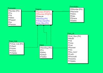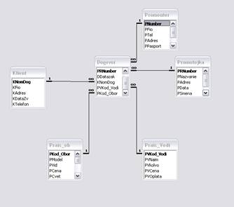 Определим связи между сущностями предметной области. Связи ПРОМОУТЕР - ДОГОВОР и ПРОМОТОЧКА - ДОГОВОР являются идентифицирующими мощностью один-ко-многим. Один промоутер может заключать множество договоров, и на одной промоточке может быть заключено множество договоров. При установлении таких связей произойдет миграция ключевых атрибутов № промоутера и № промоточки в состав первичного ключа дочерней сущности ДОГОВОР.