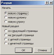 3) Если несколько столбцов текста целиком размещаются на одной странице, можно сделать так, чтобы колонки имели одинаковую длину. Для этого надо дать команду «Вставка » → «Разрыв », установить переключатель «На текущей странице » и щелкнуть на кнопке «ОК».