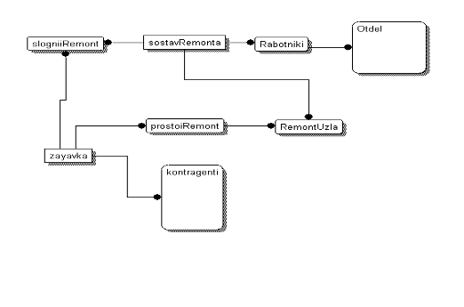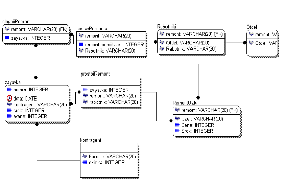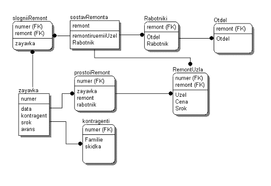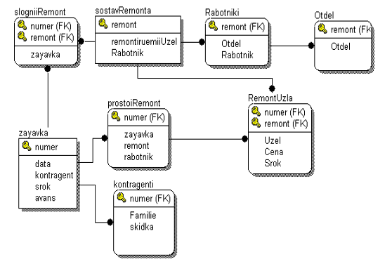 - Сущность “Состав Ремонта”. Она содержит сведения о виде ремонта, ремонтируемом узле и работнике, выполняющем данный вид работ.