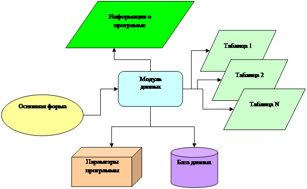 Для большей универсальности имеет смысл всю специфику вынести в модуль данных, а для работы с таблицами сделать одну общую универсальную форму. Для этого мы будем использовать ряд возможностей, которые нам предоставляет система программирования Delphi. А структура нашей программы будет выглядеть, как приведенная на рис 1.1.