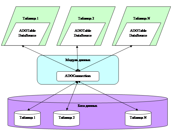 Для подключения к базе данных Access наиболее простым и универсальным способом является технология ADO. Об особенностях реализации этого подхода мы поговорим позже, а сейчас рассмотрим какие информационные потоки необходимо реализовать в нашем проекте (рис.1.4).
