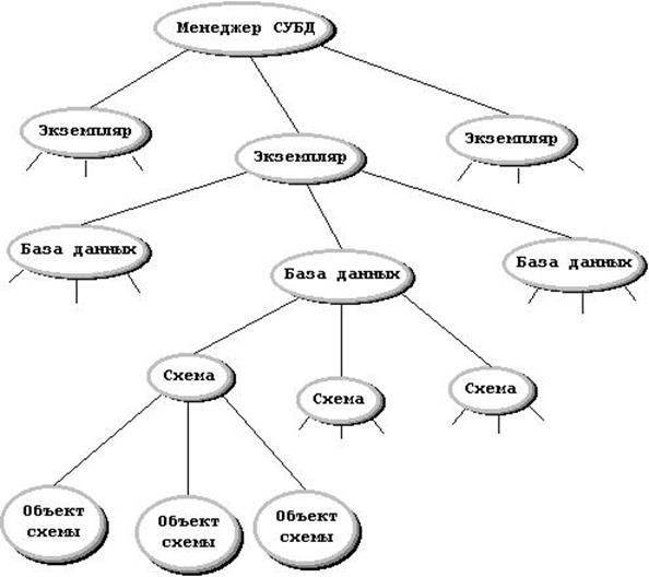 - экземпляр (instance) менеджера СУБД - логическая среда, которая характеризуется своими ресурсами и параметрами. Экземпляр, однако, по разному понимается разными СУБД. С точки зрения Oracle экземпляр - это среда времени выполнения, его ресурсы составляют набор выполняющихся процессов Oracle и область оперативной памяти (SGA - system global area). В каждом экземпляре Oracle "монтируется" и "открывается" одна база данных и экземпляр выполняет функции монитора этой базы данных. DB2 и MSSQL понимают под экземпляром логическую среду, включающую в себя несколько баз данных и постоянно хранимые параметры. Экземпляр, таким образом, является монитором нескольких баз данных. Экземпляры выполняются совершенно независимо друг от друга. Такой механизм позволяет осуществлять раздельное администрирование и настройку параметров экземпляров, повышает безопасность и надежность обработки данных.