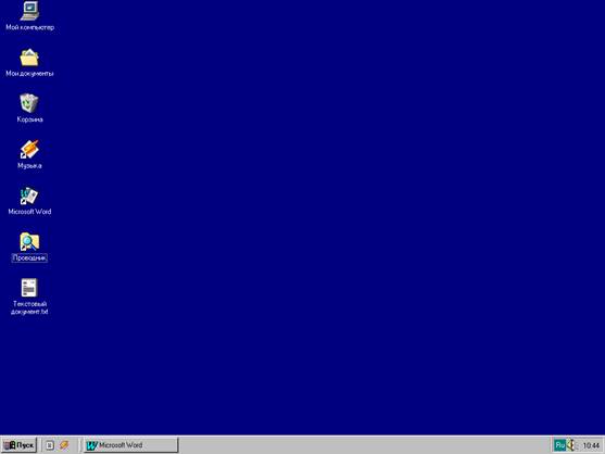 По левому краю экрана находится семь ярлыков. Внизу экрана находится панель задач с кнопкой Пуск, панель Быстрый запуск, одна кнопка задач и область индикаторов. В Windows 98 схема рабочего стола, его содержание и стиль оформления с лёгкостью изменяются. Рабочий стол настраивается в соответствии с вашим вкусом и настроением, и в дальнейшем его внешний вид легко изменить.