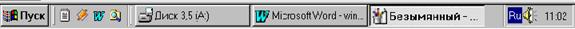 В начале работы с Windows 98 панель задач выглядит как полоса серого цвета в нижней части экрана, на которой отображается кнопка Пуск в левой её части, а индикатор языка и часы – в правой. Также в строке панели задач может располагаться панель Быстрый запуск и некоторые другие специальные панели. По мере того как запускаются приложения, на панели задач появляются соответствующие им кнопки. По ним сразу можно видеть, какие приложения выполняются в настоящий момент. Щелчок по кнопке позволяет мгновенно переключиться на соответствующее приложение.