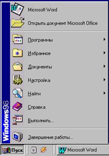Панель задач (рис. 2.) обеспечивает открытие программ и документов, а также доступ к объектам, которые уже были открыты. Меню ПУСК на панели задач содержит пункты, которые позволяют получить доступ к программам, документам и другим объектам. Оно содержит также команды для запуска программ из командной строки, установки системных параметров и завершения работы Windows 98.