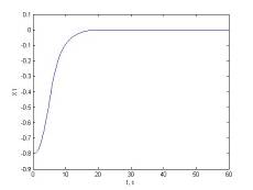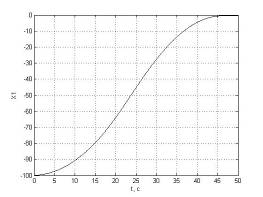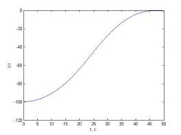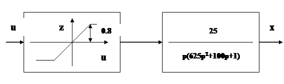 Первые представления о характере процессов в управляемом объекте можно сделать по структурной схеме. Объект является нелинейным, так как состоит из последовательно соединенных существенно нелинейного звена типа насыщение, интегрирующего звена и апериодического звена второго порядка, поэтому в состоянии статического равновесия объект находиться не может – при любом значении управляющего воздействия U, кроме нулевого. Выходная координата Xбудет возрастать по абсолютному значению. В объекте возможен установившийся режим- движение с постоянной скоростью изменения выходной координаты, который наступит после окончания переходного процесса в апериодическом звене второго порядка при условии, что управляющее воздействие постоянно. Максимальная скорость изменения выходной координаты зависит от значения управляющего воздействия и параметров нелинейного звена с характеристикой типа насыщение. Очевидно, что после звена с насыщением значение сигнала не может превышать ±0.8, поэтому численное значение установившейся скорости не превышает 20 с учетом коэффициента передачи объекта по управляющему воздействию, равному 25. Характер нарастания выходной координаты вначале движения при подаче на вход ступенчатого управляющего воздействия должен быть!!!!монотонным!!!, так как он определяется апериодическим звеном второго порядка, корни характеристического уравнения которого равны: