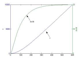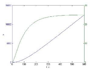 Предположения при анализе структурной схемы управляемого объекта подтвердились, т.е. при подаче на вход ступенчатого воздействия выходная координата неограниченно растет, а изменение ее скорости носит монотонный характер.