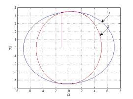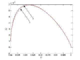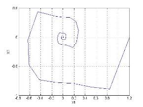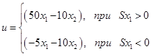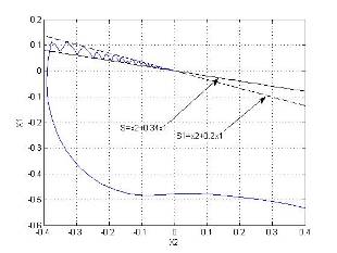 На первом этапе нами была синтезирована СПС без учета нелинейности с линией скольжения S1 . Затем для синтеза СПС с нелинейным элементом мы синтезировали релейную систему для больших отклонений с линией переключения S2 = 0.9x1 + 5x2 + d,где значение d определяется координатами точки пересечения линий S1 и S2 . Значение d определяет характер процесса в СПС на завершающей стадии движения.