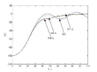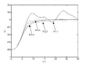 Исследуем влияние периода квантования на устойчивость системы “в малом”. Подадим на вход системы управляющее воздействие, не выходящее за пределы линейной зоны нелинейного элемента, и построим переходные характеристики цифровой системы при различных значениях периода квантования.