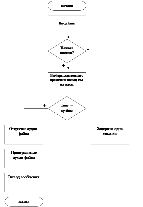 Алгоритм работы программы (приложение А) начинается с ввода пользователем времени выдачи текстового и звукового сообщения – блок один. Далее программа осуществляет выборку значения системного времени – блок два. Для последующего оповещения пользователя о наступлении заданного времени необходимо реализовать подучу звука – блок 3.