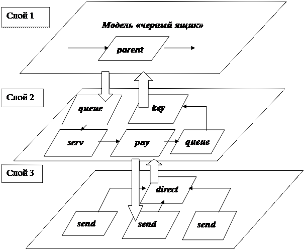 Пример изображения модели в виде многослойного иерархического графа, полученного при структурном анализе процесса, показан на рис. 1.