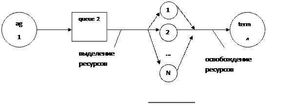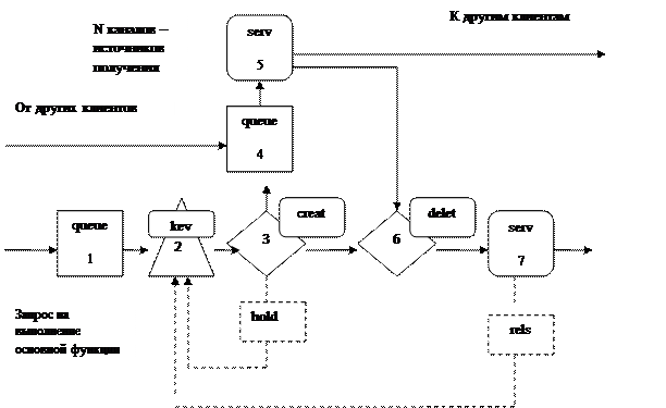 Стартовый информационный ресурс дает возможность отправить заявку на выполнение какой-либо функции, т.е. поместить транзакт в очередь на обслуживание. На рис. 6 показана схема получения такого ресурса. Для выполнения основной функции нужны только два узла: первый (очередь queue) и седьмой - последний (обслуживающий процесс serv). Узлы 2 - 6 предназначены для имитации получения информации из N источников. Эти источники – каналы в узле обслуживания 5 (serv). В данном случае предполагается, что ко всем каналам или источникам информации доступ осуществляется через общую очередь 4 (queue). Если необходимо смоделировать отдельные механизмы доступа к каждому уникальному источнику информации, то данную схему нужно усложнить: это будет N очередей к N одноканальным узлам обслуживания.
