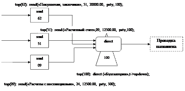 Распорядитель финансов («главный бухгалтер») имеет наименование direct. Он управляет работой узлов типа send. Причем для правильной работы модели достаточно одного узла direct; он обслужит все счета без нарушения логики модели. Однако не будет ошибкой, если каждый счет send будет обслуживаться отдельным бухгалтером direct. Поэтому, чтобы разделить статистику по разным участкам моделируемой бухгалтерии, можно использовать несколько узлов direct.